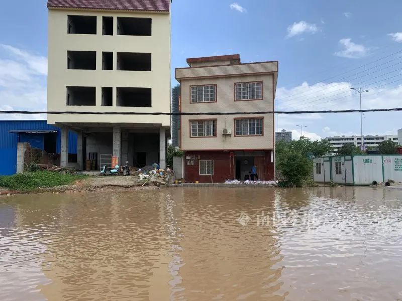 5月26日中午,记者接报来到凌先生家看到,凌先生家就位于白阳东路边上,他们一家十口居住在一栋3层楼的私人房。家门前的道路因大量积水,已形成一个二三十米长、约二十余米宽、深度达半米的大水塘。