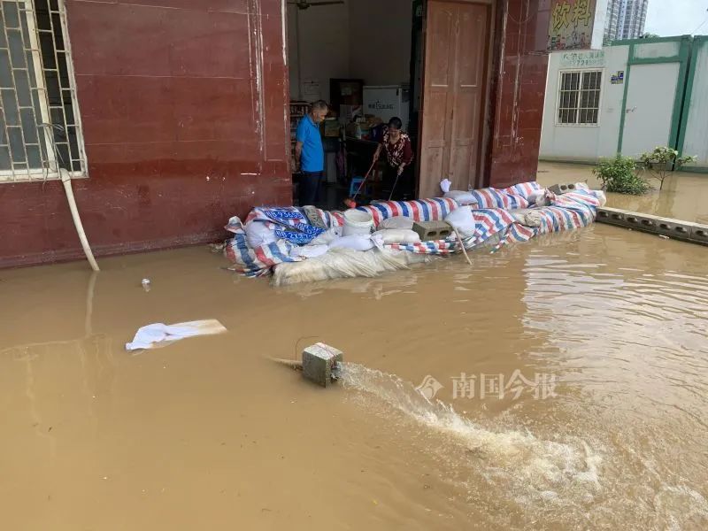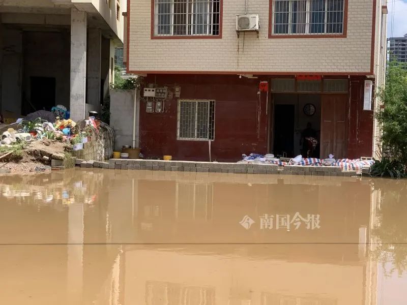 为了抵御积水,凌先生在家门口用沙袋建了拦水坝,但仍有水从缝隙不断往屋里灌。由于民房被积水包围,凌先生一家只能靠堆砌的砖块出入。