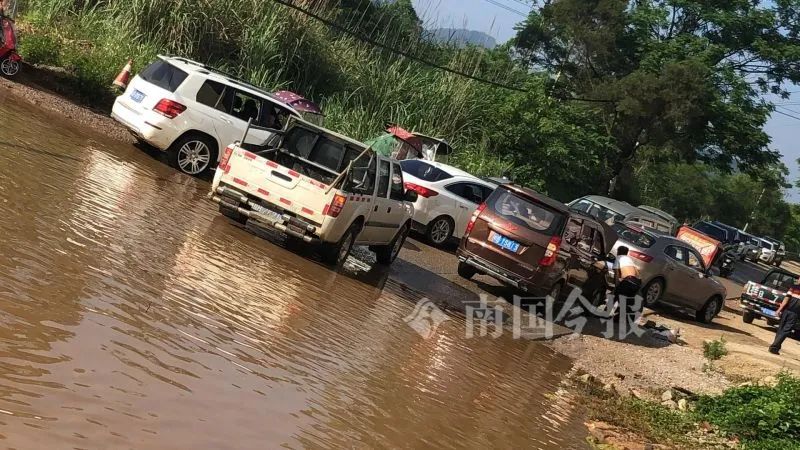 由于水塘积水较深,不少车辆纷纷从水塘边的泥巴路绕道而行。由于泥巴路狭窄且坑洼,在高峰时段,该路段经常拥堵,车队排成长龙。