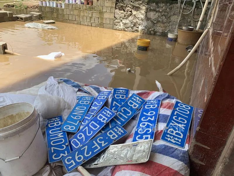 大量车辆从积水中冲过时,车牌脱落掉在水里,凌先生已经捡到十几块了,而且水中还有不少车牌没捞起来。在凌先生家门口,记者看到确实有不少车牌堆在沙袋上。