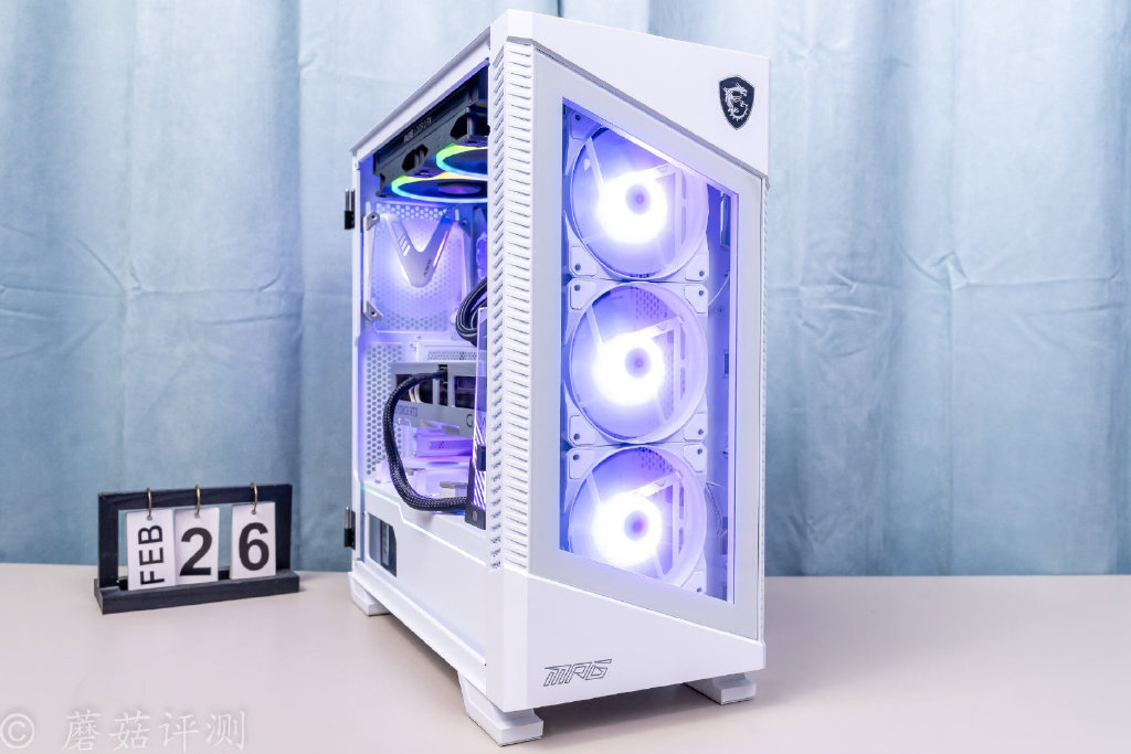 ▼机箱是微星的刀锋100R机箱,机箱前部有大面积的玻璃侧透,内部标配三把支持ARGB灯效的机箱风扇,整体的颜值非常漂亮。