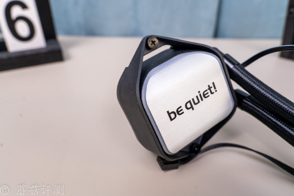 ▼水冷头顶部有熟悉的be quiet!的LOGO,顶盖是铝合金材质的,表面有拉丝处理,质感不错。