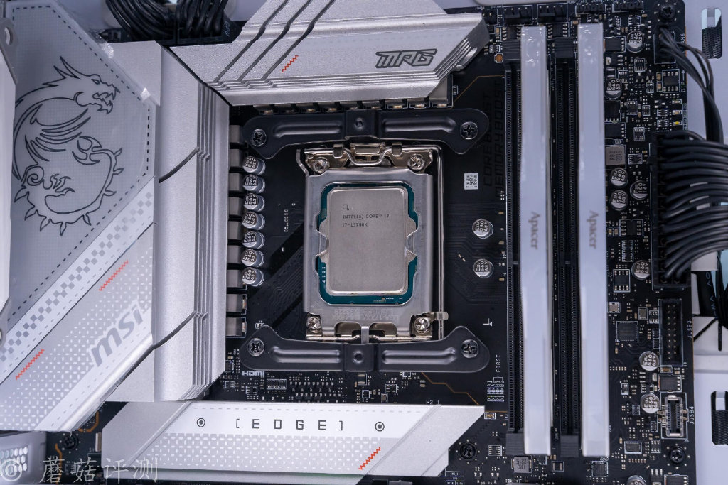 ▼搭配13700K的主板,是微星的Z790刀锋D4,这块板子的用料非常不错,供电模组采用16+1+1相供电,其中Vcore供电16相,清一色的DrMos的用料,非常给力。另外,左侧供电模组和上侧供电模组上面均覆盖有体积硕大的金属散热片,可以辅助供电模组散热,保证其稳定运行。