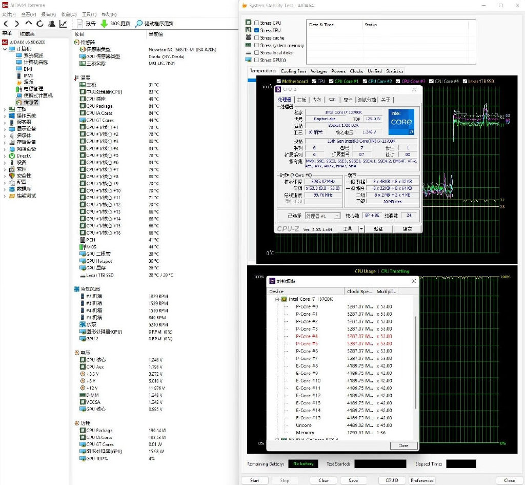 ▼简单跑个CPU-Z的压力测试,处理器功耗190W左右,大核心睿频5.3GHz,小核心睿频4.2GHz,水泵转速提升到5200转左右,处理器温度在83℃,散热效果非常不错。另外,看看处理器的温度曲线,能明显看出,水泵转速有一个提高的过程,提高之后,整体的散热效果提升非常明显,处理器温度在刚开始到达一个高峰,然后缓慢下降。