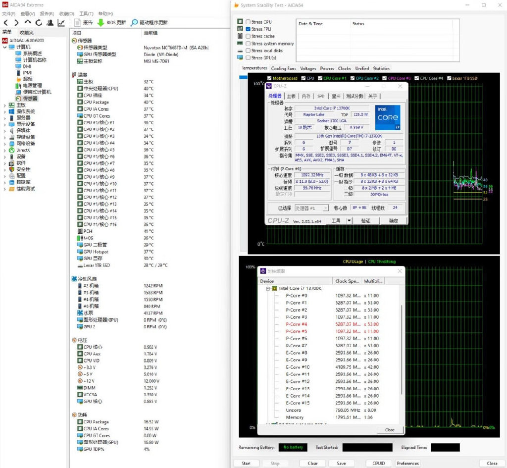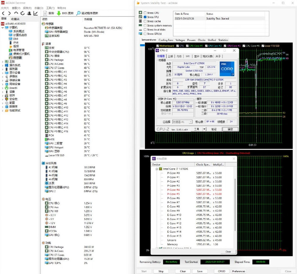 ▼单烤FPU测试,处理器功耗245W左右,大核心睿频5.3GHz,小核心睿频4.2GHz,水泵转速在5400转左右,处理器温度在96℃左右。