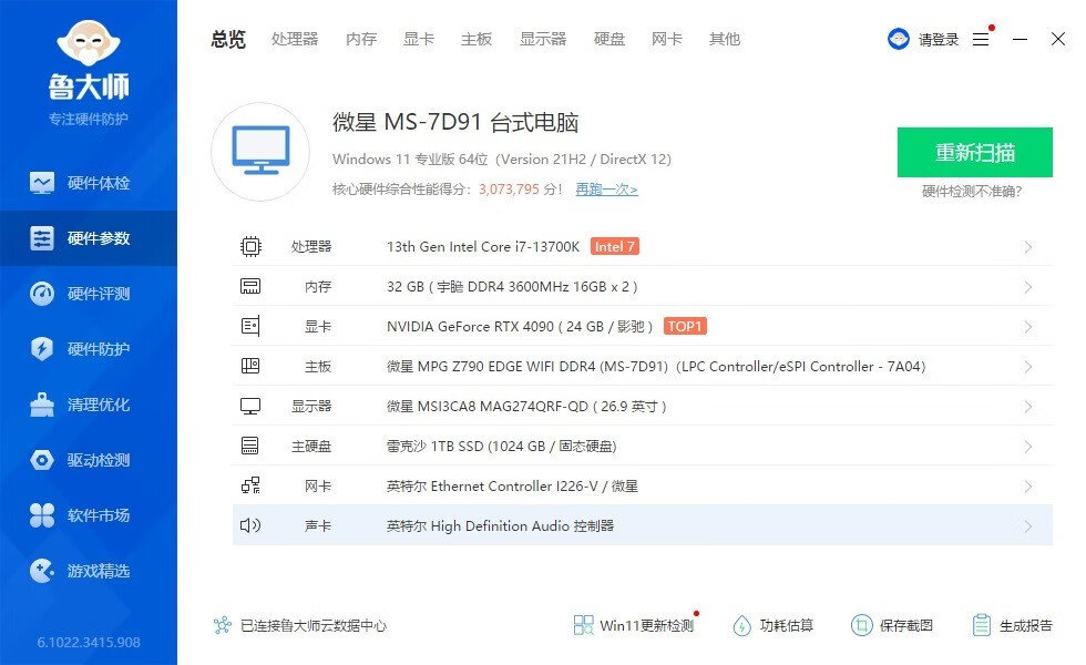 ▼整机配置一览,处理器是13700K,主板是微星的Z790刀锋D4,显卡是影驰的RTX4090金属大师OC。