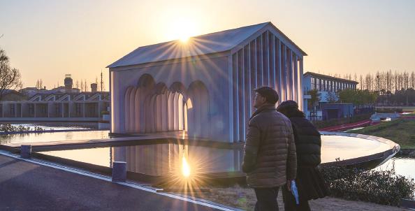 在崇明岛陈家镇东瀛路上,有一座由废弃水泵房改造而成的牛奶咖啡驿站,已成为不少游客的拍照打卡点。棕色水池象征咖啡,白色房子象征牛奶,层层叠叠参差掩映的门洞和交叠的云朵剪影,相映成趣。