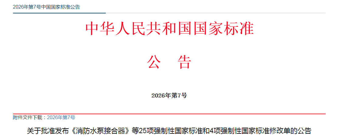国家市场监督管理总局(国家标准化管理委员会)批准《消防水泵接合器》等25项强制性国家标准和4项强制性国家标准修改单,现予以公告。